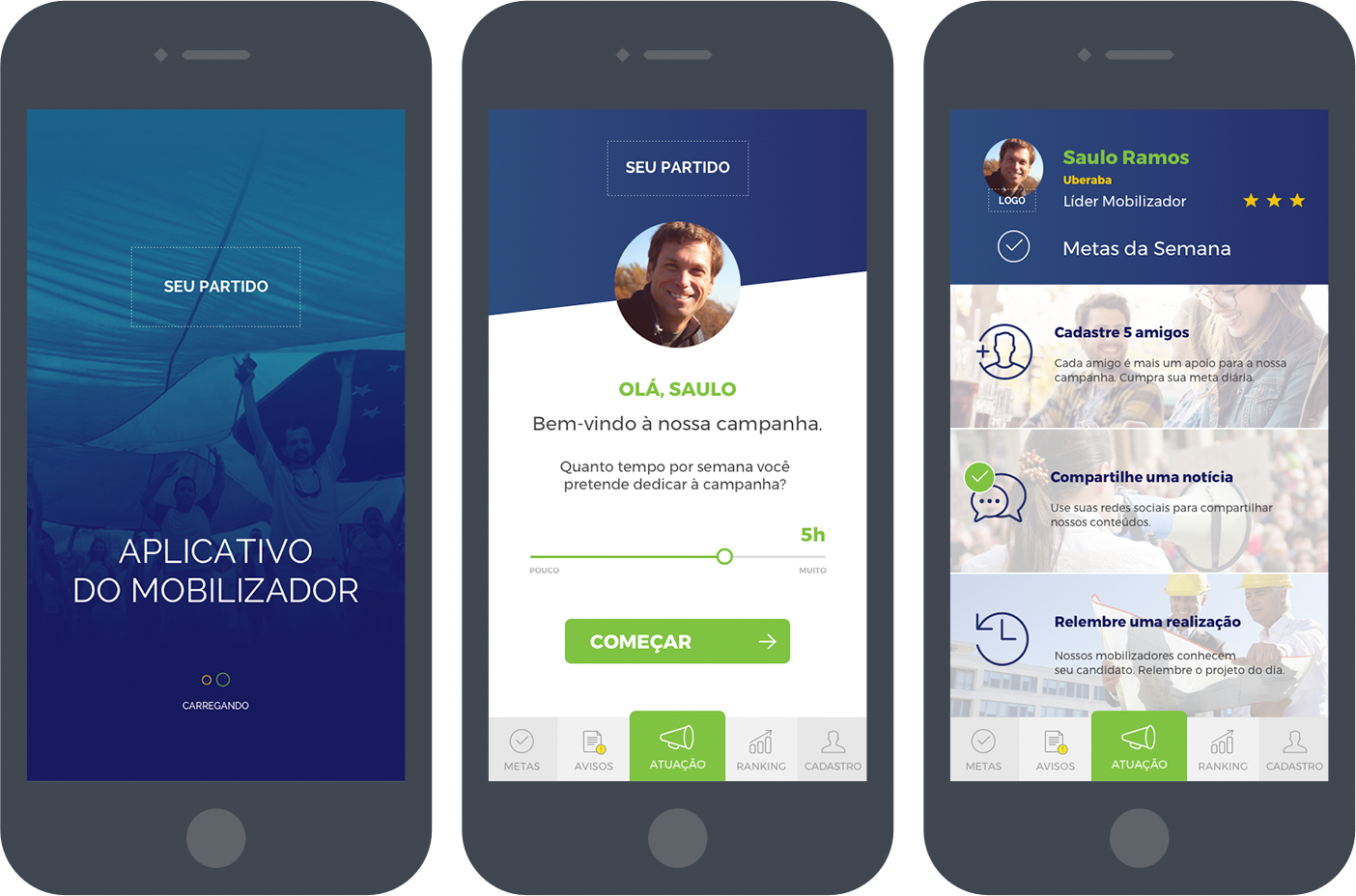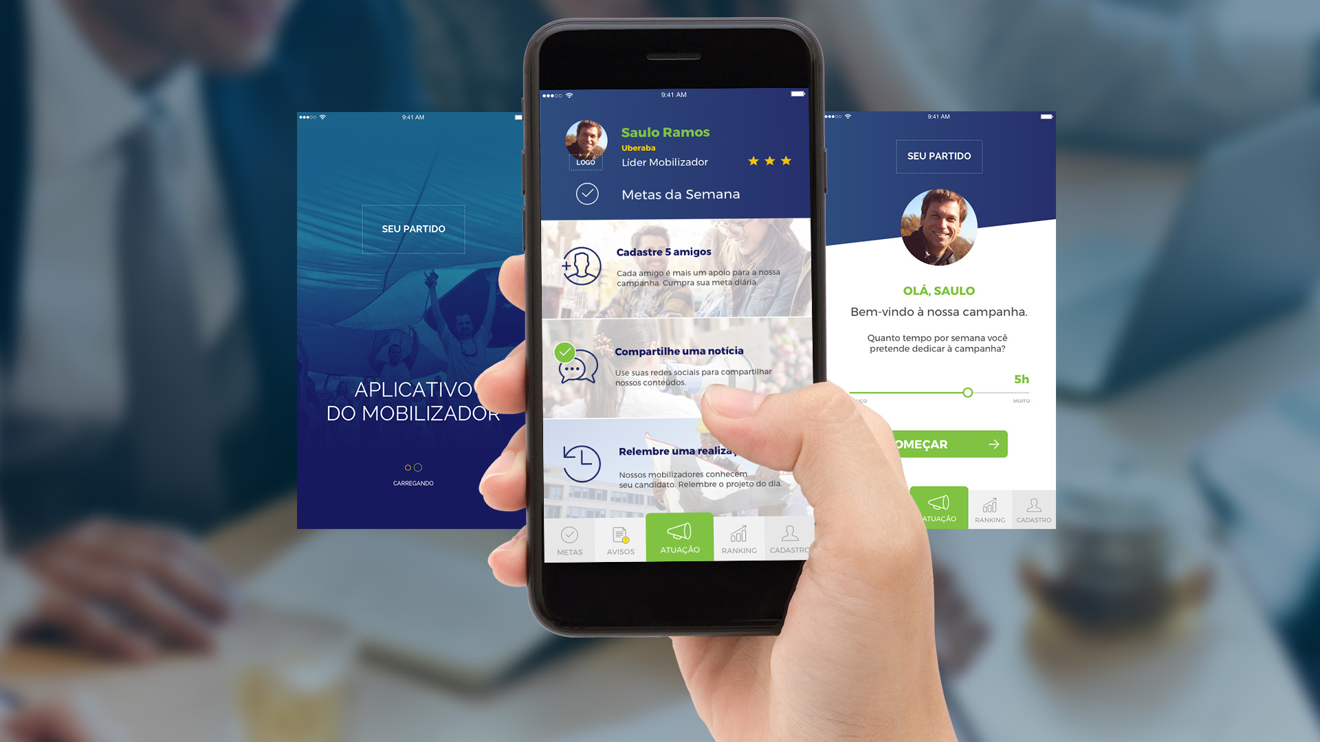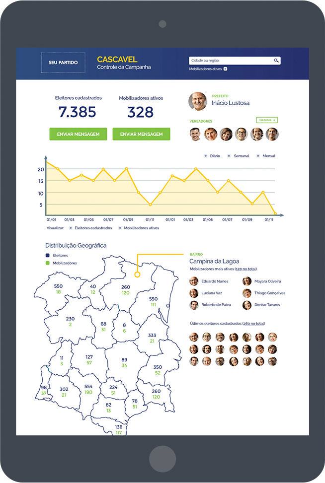 Um aplicativo com estratégias de gameficação conecta toda a equipe à campanha, atribuindo metas semanais de atuação, compartilhando informação em tempo real e valorizando os mobilizadores mais ativos.